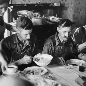 Dwellers in Circleville's 'Hooverville,' central Ohio Adjusting straw stocker on grain separator, central Ohio Boy in front of liquor store, Newark, Ohio Detail of farm on Route 40 central Ohio Dinner time during wheat harvest, central Ohio Dinner time during wheat harvest, central Ohio